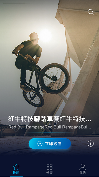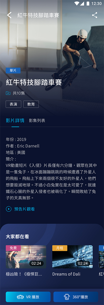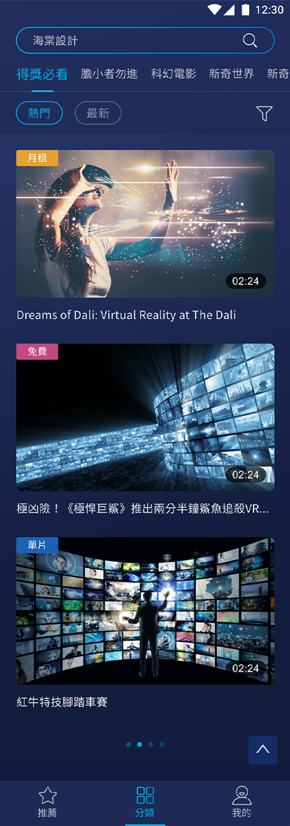 因應5G頻寬帶動VR應用服務快速成長,「沉浸式體驗」也日趨受到重視,主要是透過感官增強虛擬世界的現實感,讓使用者感到身歷其境,而屏除技術及配戴裝置的限制,在APP的介面設計上我們特別在影片推薦頁規劃全屏360度影片,會因為手機的移動而跟隨移動,增強使用者想繼續探索的欲望,使影音更具吸引力與互動性,在設計上也特別使用深色背景去聚焦影片主體,類似電影院的概念,昏暗的環境可減少光線的阻礙,讓使用者容易把焦點放在影片上,不受干擾的沉浸在影片當中。