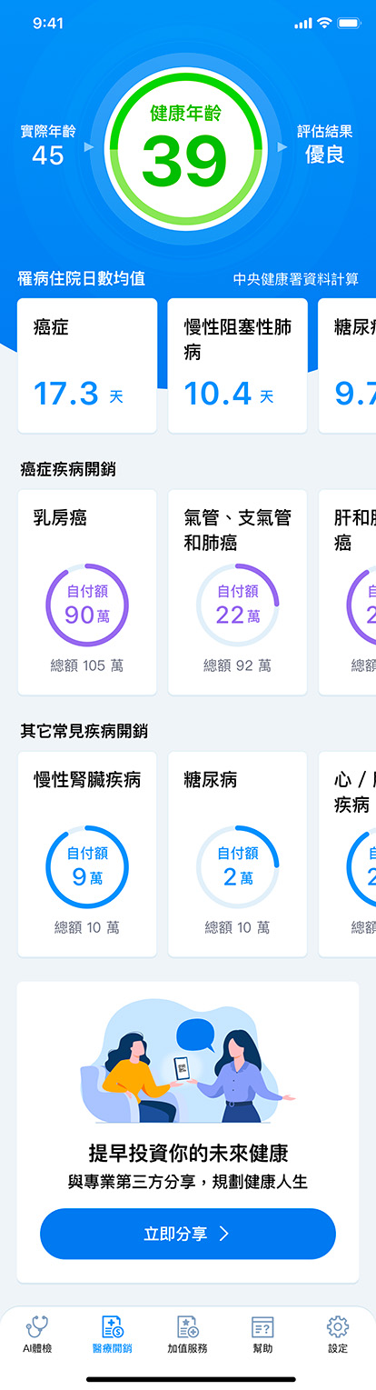在 Lydia AI 運算完成,提供使用者該健康風險評估,經研究大部分使用者無法理解過度精密的運算結果或數值,為降低使用的不安與不信任感,在設計樣式與資訊顯示的比例上,我們經過多版本的驗證與嘗試。